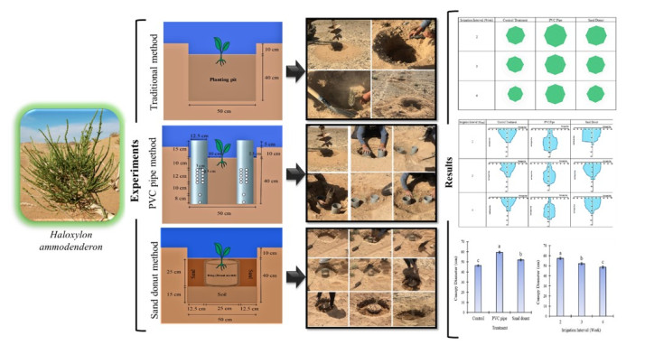 Building on this concept, our research team has applied the pipe method as a targeted deep-irrigation solution. In this method, irrigation water is conveyed through a perforated pipe and released within the root zone, creating a deeper and more stable moisture distribution compared with conventional surface irrigation. This results in more efficient water use, improved soil moisture conditions, and stronger plant establishment in water-limited environments.
