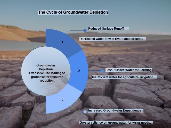 🔹 Groundwater depletion ➡️ reduced surface runoff ➡️ less surface water for farming ➡️ increased groundwater dependence.