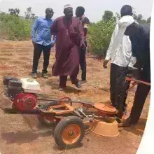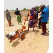 The Zainer is a vertical soil drill, mounted on a two wheeled cart and powered by a small 5hp petrol engine. Excavated soil is deposited on the down-stream side of the Zaï pit to make sure that run-off water from the field is directed into the pit for local infiltration. The design of the Zainer has been optimized for fuel efficiency and drilling speed to minimize the operational costs for the farmer.