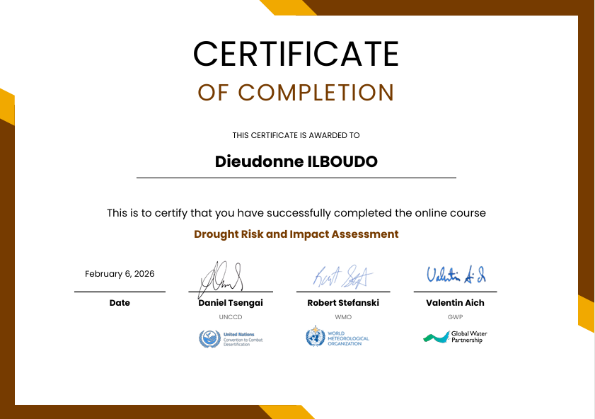 I am pleased to share that I have received my certificate from the online course "Drought Risk and Impact Assessment," delivered by UNCCD, WMO, and the Global Water Partnership (GWP). This training has strengthened my skills in drought risk and impact assessment, quantitative and qualitative analysis, understanding cascading and compound risks, and impact-based early warning systems. I strongly encourage professionals in the water, agriculture, climate, and development sectors to take this training to better anticipate and mitigate the impacts of drought. Together, let's build resilience to drought. https://droughtclp.unccd.int/course/drought-risk-and-impact-assessment